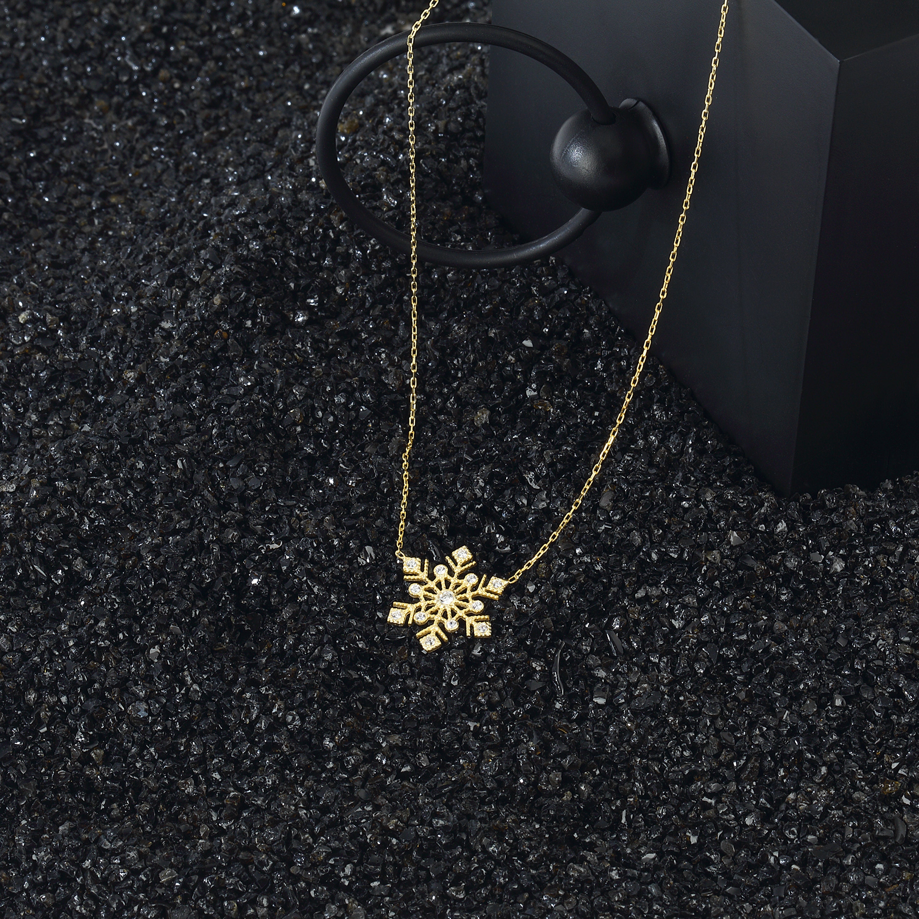 Made from High Quality 925 sterling silver, this necklace boasts premium quality zircon crystals that shimmer like freshly fallen snow. The chain, designed for comfort and style, complements the intricate design of the pendant. The snowflake itself is adorned with a high-quality solid 14K gold plating, adding a touch of warmth and luxury.