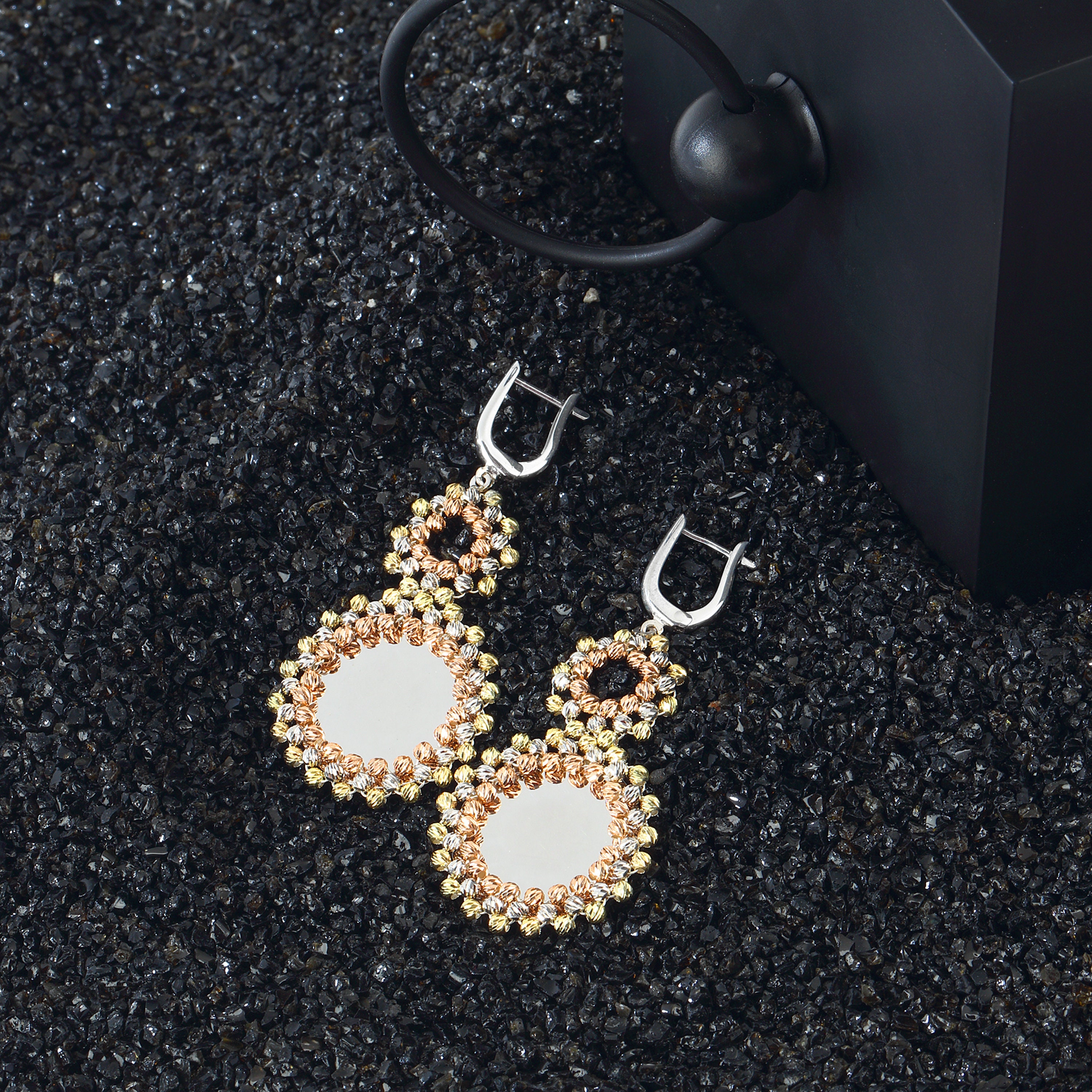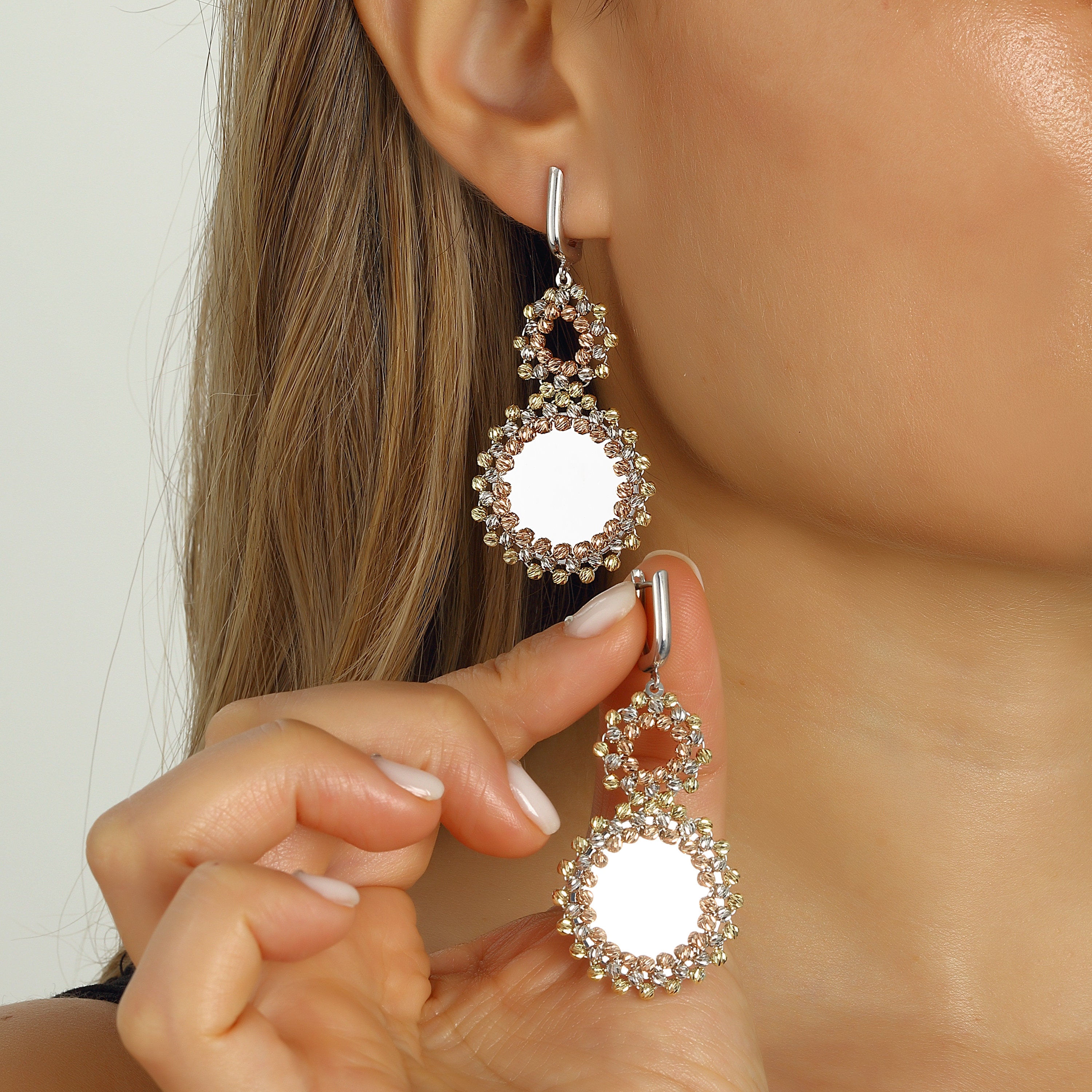 These hoop earrings are made of 925 sterling silver. It consists of 2 separate rings, one big and one small. In the middle, there is a silver plate that acts as a mirror. It is decorated with silver beads elaborately embroidered with lapidary. These silver beads are plated with 14 carat rose and gold. With its special clips, it will stand firm while swinging in your ear.