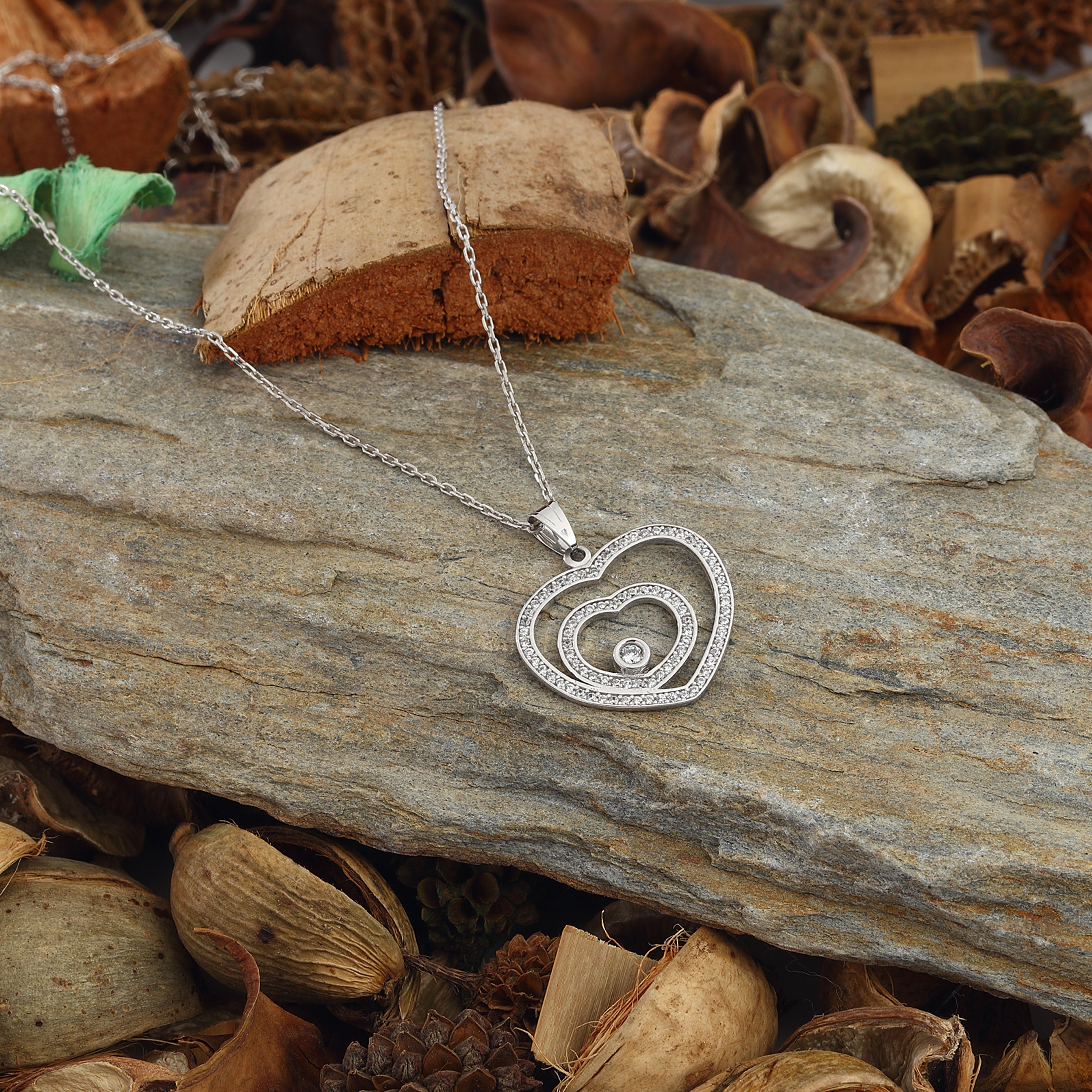This heart necklace is made of 925 sterling silver. The circumference of the hearts is decorated with the highest quality, most precious zircon stones. In the middle of the hearts, there is a zircon stone that looks like a diamond.