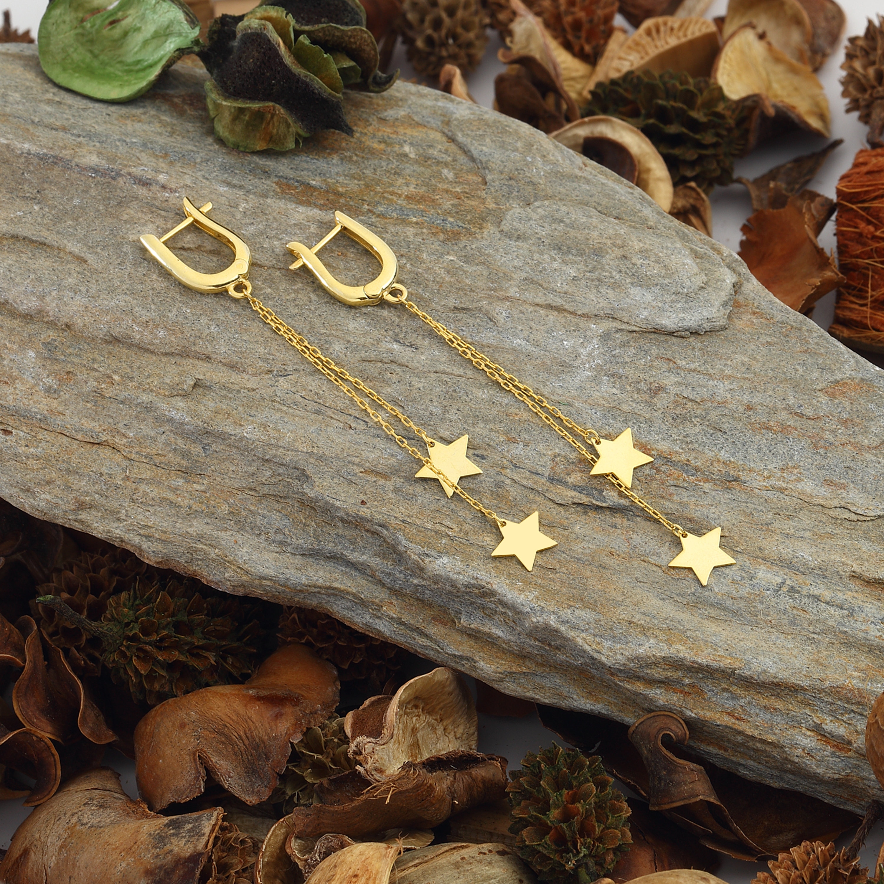These elegant dangle earrings are crafted from 14k gold-plated silver and adorned with stars. Part of our Starry Night collection, these exquisite earrings will captivate you with the beauty of the night sky.